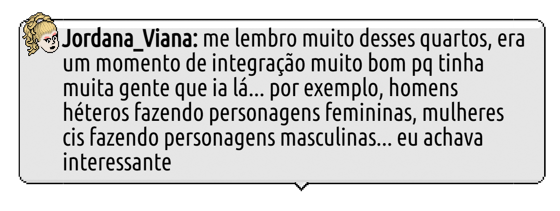 Para além da montagem dos personagens, o avatar de Jordana rondava pelos quartos com roupas predominantemente femininas, o que segue até hoje em qualquer jogo em que ela esteja. Olhando para o passado, questionei sobre o que ela achava dessa escolha. Ela logo diz, sem pensar muito: “na época eu não sabia, mas hoje em dia, eu acredito que era mais um processo de auto-identificação”.