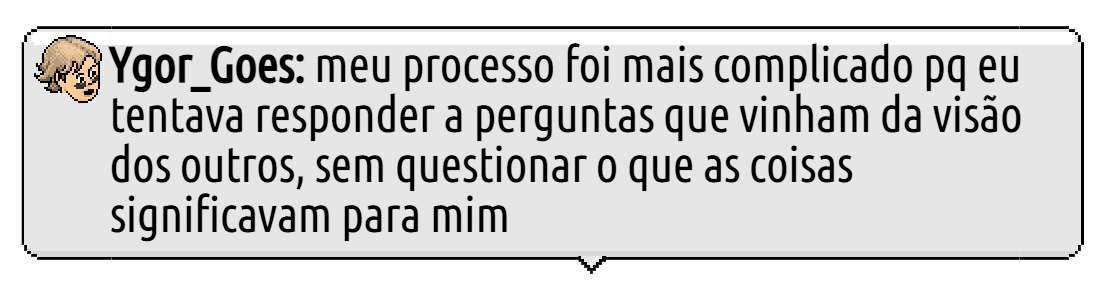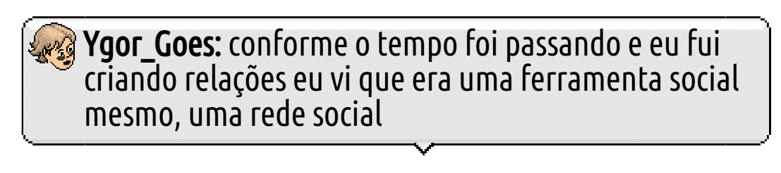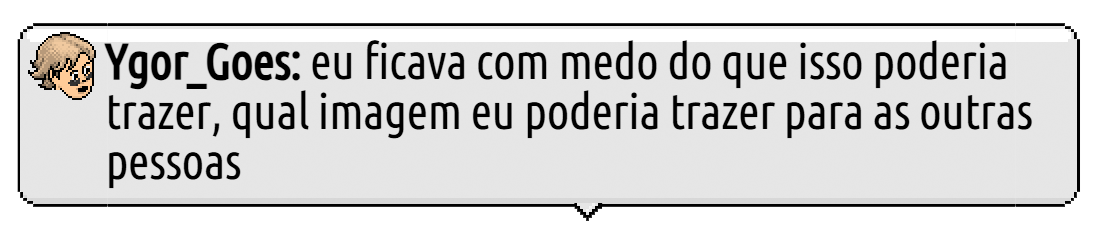 Na mesma oportunidade, sem titubear, o corpo de Ygor era também marcado como aberrante, antes mesmo que ele soubesse que desviava da normatividade. As “várias questões internas” que carrega foram se desenrolando ao longo dos anos por meio de uma tela e de pessoas muito mais velhas do que ele, uma criança de apenas nove, dez anos. O Habbo foi também um refúgio quando, por exemplo, a escola não conseguia lidar com seu direito de ter escolhas diferentes dos demais.