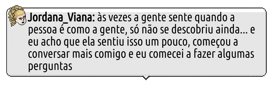 Por um tempo, por causa do medo, ninguém conseguia conversar com Jordana fora do jogo. Contato por redes sociais, skype que seja? Além de não ser incentivada pela Habbo Etiqueta, ela não buscava uma forma de burlar a regra para ter um contato fora do jogo. Qualquer tentativa de interação com ela já era motivo para alguém ser bloqueado, denunciado e até levá-la a apagar sua conta e criar outra. Com esse filtro, durante anos, a comunicação “digitada” era um dos critérios para Jordana escolher estar em um jogo, ou não.