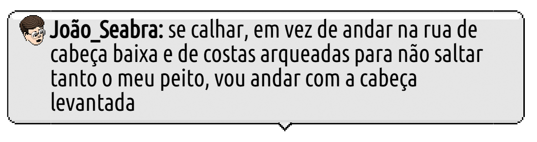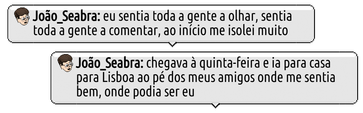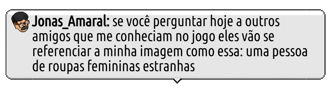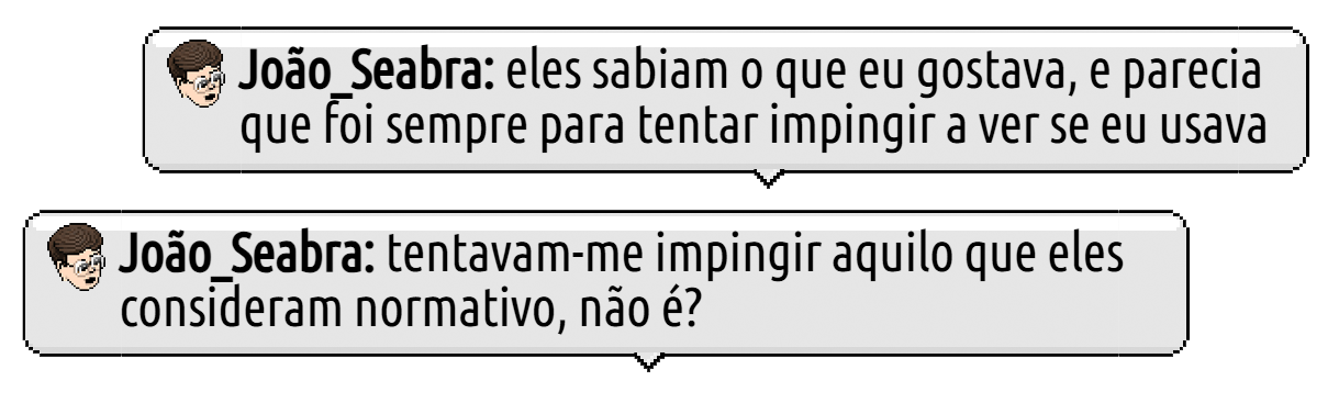 O personagem do João nasce no Habbo com um corpo “sempre masculino” e que “sempre buscava raparigas [meninas]” pelos quartos pixelados. Sem lembrar ao certo qual era o seu nome, a memória foi certeira quanto às características virtuais: calças largas, camisetas, cabelo partido ao meio, óculos - quando possível - e tênis. Essas características também me foram muito marcantes e visíveis quando o vi, pela primeira vez, nos corredores de uma universidade no Alentejo, em Portugal.