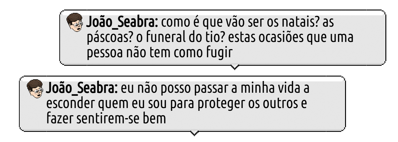 Aí vem o sentimento de não ser ninguém, de não ter uma personalidade e uma vida. Aos olhos da família, ele é como uma pessoa jogadora de Playstation e estudante. Não imaginam que ele faça algo a mais na vida. “A minha mãe não podia dizer a ninguém que eu saía à noite, ou muito menos que o meu grupo de amigos era só de rapazes”. E mesmo que isso chegasse até eles, segundo João, não havia interesse porque ele “não era um homem”.