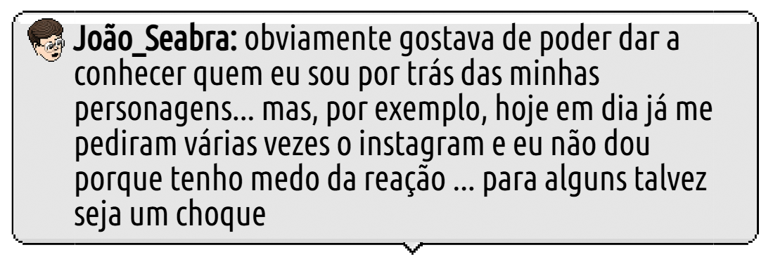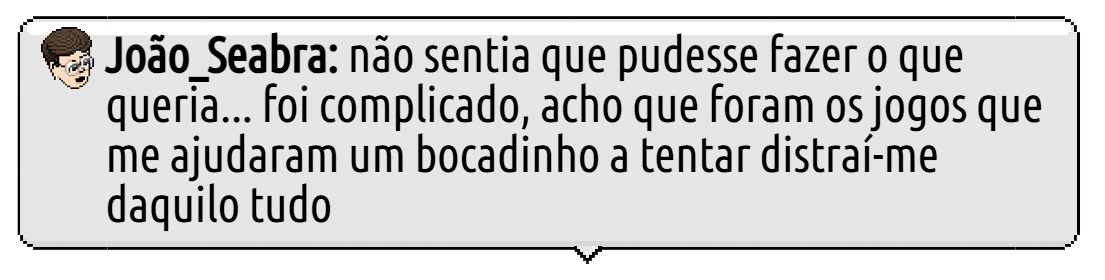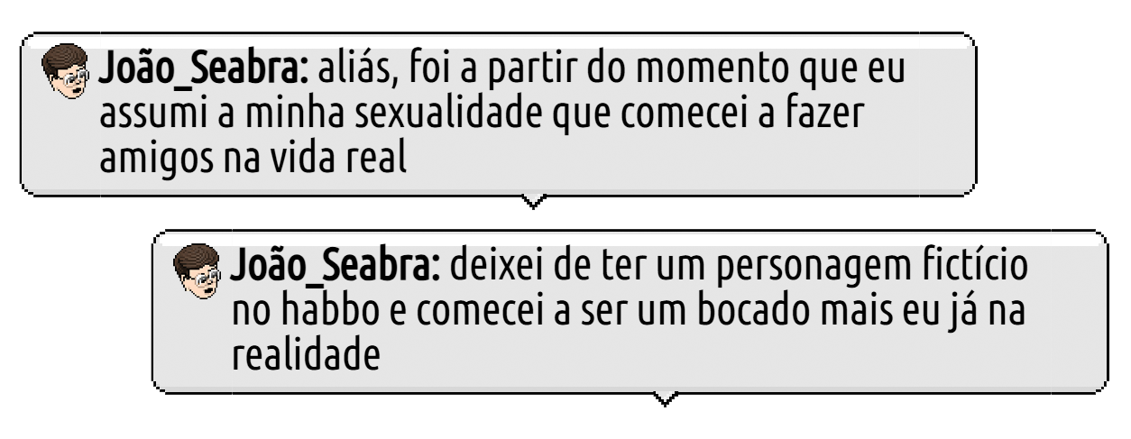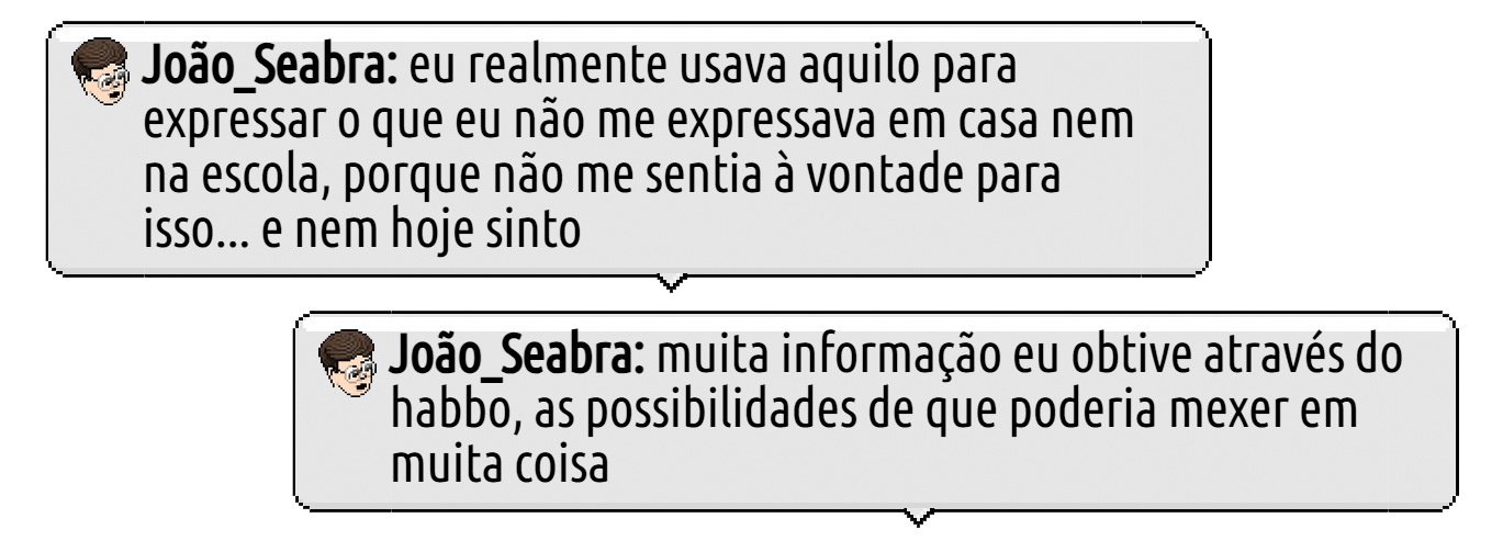No caso do João, não pela opção de respeitar a Habbo Etiqueta, mas pela insegurança de apresentar um rosto que ainda não condiz com a sua identidade, os amigos e amigas que fez pelos jogos sequer tiveram acesso a algo tão íntimo para ele: seu corpo real. Apesar do Habbo não estar mais dentre a rotina de jogos dele, a história ainda acaba se repetindo, em outras plataformas.