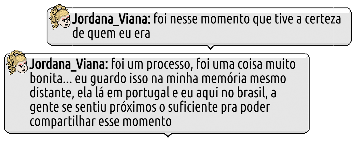 Eles são pontes comunicativas muito importantes. Jonas e Ygor foram essas figuras bem significativas até hoje na minha vida e que foram conhecidas a partir da vida virtual. Mesmo que, à época, no caso de Jonas, ele tratasse da vestimenta feminina com normalidade no jogo, e isso fosse algo incogitável na vida real, foi só a partir da construção de alguns laços que eu pude perceber que isso também se passava no meu mundo real.