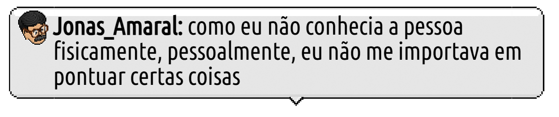 Por mais que Jonas marcasse essa diferença entre os dois mundos, pelo perfil conversador, ele ainda garantia que alguém soubesse algo sobre a sua vida no mundo real, mas com informações reservadas, omitindo, ou não contando tudo. Por outro lado, no abrir do computador, era hora do “foda-se” - desculpe o termo, como ele mesmo colocou após soltar a palavra.