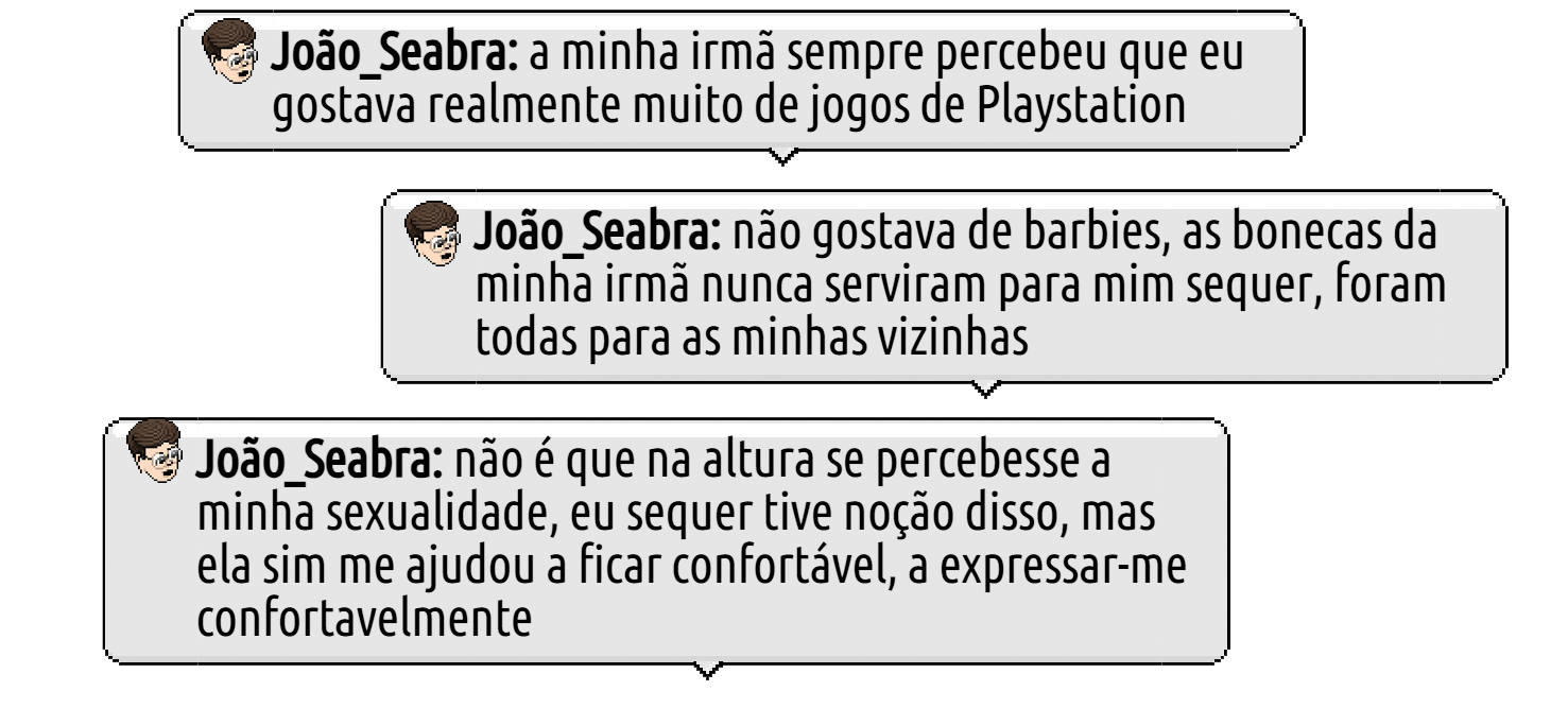Ele me conta, com sorriso no rosto, que conversava todos os dias com essa garota - “se é que de facto era uma rapariga [garota]”, conta. Ele ia até o jogo buscar várias vezes pelos papos com ela. Foi nesse momento que ele percebe ter tido um encontro com a questão da sua sexualidade - sobre a idade, ele diz que tinha por volta dos 12 anos. Olhando para o passado, João diz que são “sinais que já podiam ser percebidos”.