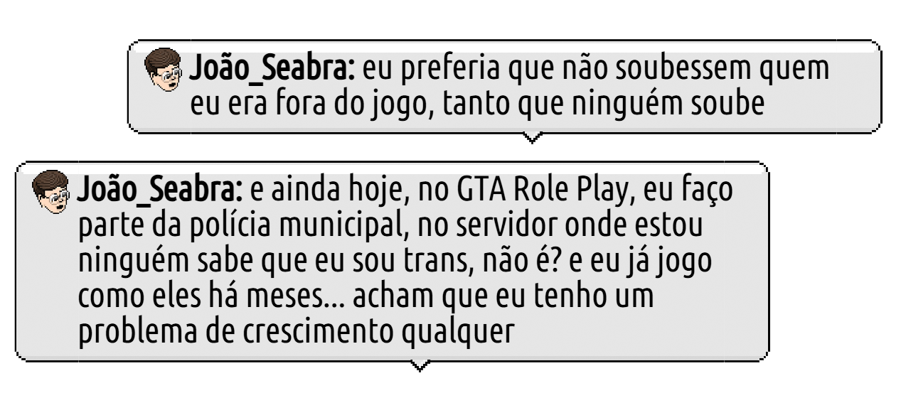 O problema de crescimento que João pontua é em relação a sua voz. Ao contrário do Habbo Hotel, no jogo GTA Role Play, também na estrutura multiplayer, há a possibilidade de interagir com outros usuários por meio do bate-papo por voz. Durante o tempo que tem passado na plataforma, ele enfrenta questionamentos quanto à sonoridade e a forma que sua voz tem chegado aos demais. Apesar de não haver um questionamento explícito sobre o “gênero” dele, a situação se desenrola sob uma perspectiva de que ele teria uma “puberdade retardada”. Tanto a voz quanto a aparência “de um puto [pirralho] de 15 anos” são alguns pontos que o levaram, por exemplo, a decidir iniciar a sua transição de gênero.